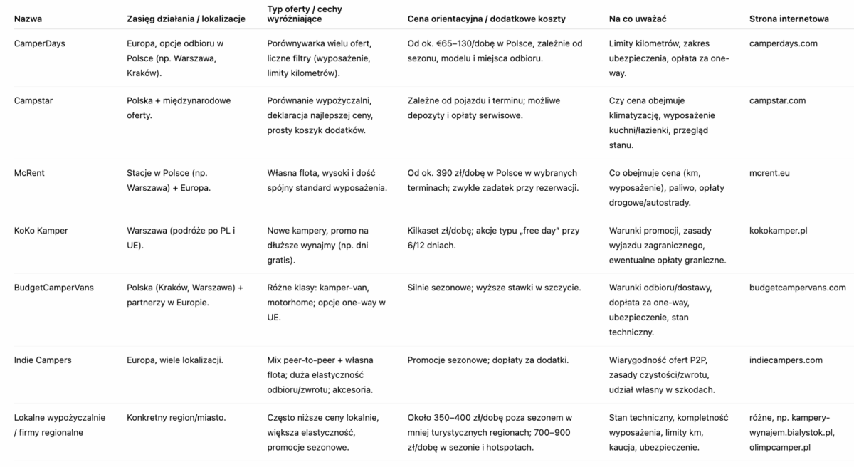 | Weekend majowy, 4-osoby, Polska północ (np. Trójmiasto) | początek maja, 3-4 dni | Kamper komfortowy z kuchnią, łazienką, klimatyzacją | Lokalnie wypożyczalnie mogą mieć oferty ok. 400-600 zł/doba przy wcześniejszej rezerwacji; większe firmy mogą prosić o ~700-900 zł/dobę plus opłaty |
