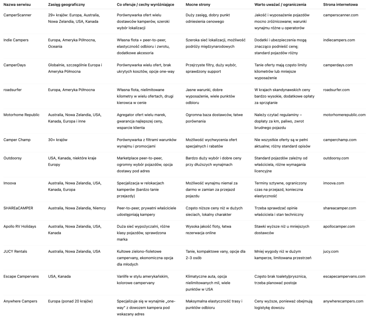 Poniżej tabela z kilkoma globalnymi serwisami porównującymi lub oferującymi wynajem kamperów („RV / motorhome / campervan”), z wyszczególnionymi cechami, zasięgami działania i wyróżnikami. Może pomóc Ci zobaczyć, które strony warto śledzić, jeśli planujesz podróż poza Polską lub międzynarodową trasę.
